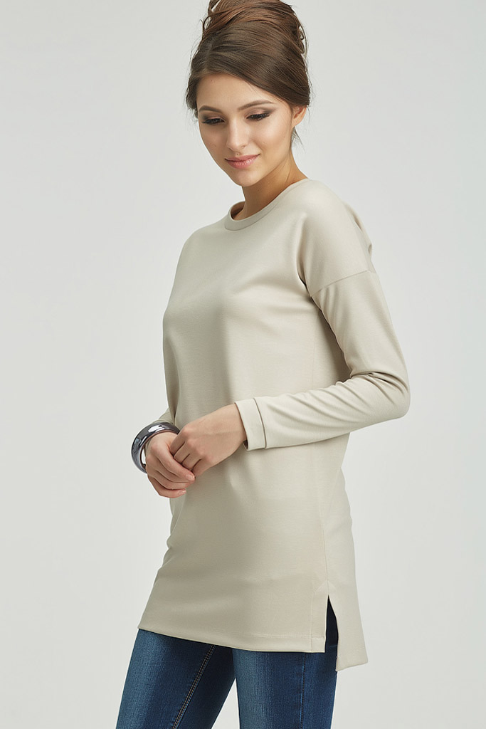Трикотажная туника свободного силуэта. Овальный вырез горловины и манжет рукава обработаны окантовкой. По боку туники выполнен разрез, перед изделия короче спинки на 3 см. Длина изделия по спинке около 75 см (44 р,48 р). Модель представлена в нескольких цветовых вариантах. Для просмотра всех вариантов наберите в строке поиска 155